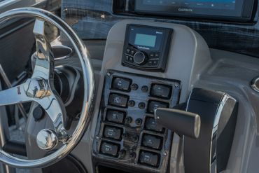 At the bow, two extended L‑shaped lounges create a comfortable, stylish space to unwind. Moving mid‑ship, the stand‑up fiberglass center‑console helm delivers a bold, confident feel. Modeled after the Pro Troll helm, it’s built to accommodate 12" Garmin electronics, a full gauge and switch array, a Rockford stereo system, and other premium features designed to enhance both cruising and fishing.