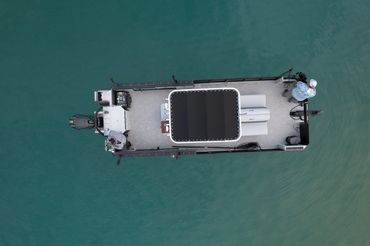 At the stern, a fully equipped workstation awaits, featuring black powder‑coated diamond plating, a starboard work surface, a 15‑gallon livewell, a high‑pressure washdown, and built‑in measuring boards. Front‑facing access doors open to storage for cranking batteries and the battery management system, making maintenance simple and convenient.