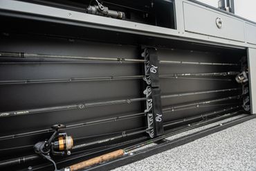 Purpose‑built for dedicated anglers, the Pro Fish N’ Cruise comes standard with a Traxstech tower and bimini system, delivering excellent fishability and weather protection while keeping the deck open and functional. A rugged binary wall provides a secure mounting base, featuring 72" tracks for downriggers or rod‑holder systems. Inside the wide wall, lockable rod storage holds up to ten 9‑foot rod‑and‑reel combos (five per side). Optional hatch storage or tilt‑out tackle modules allow for customized organization.
